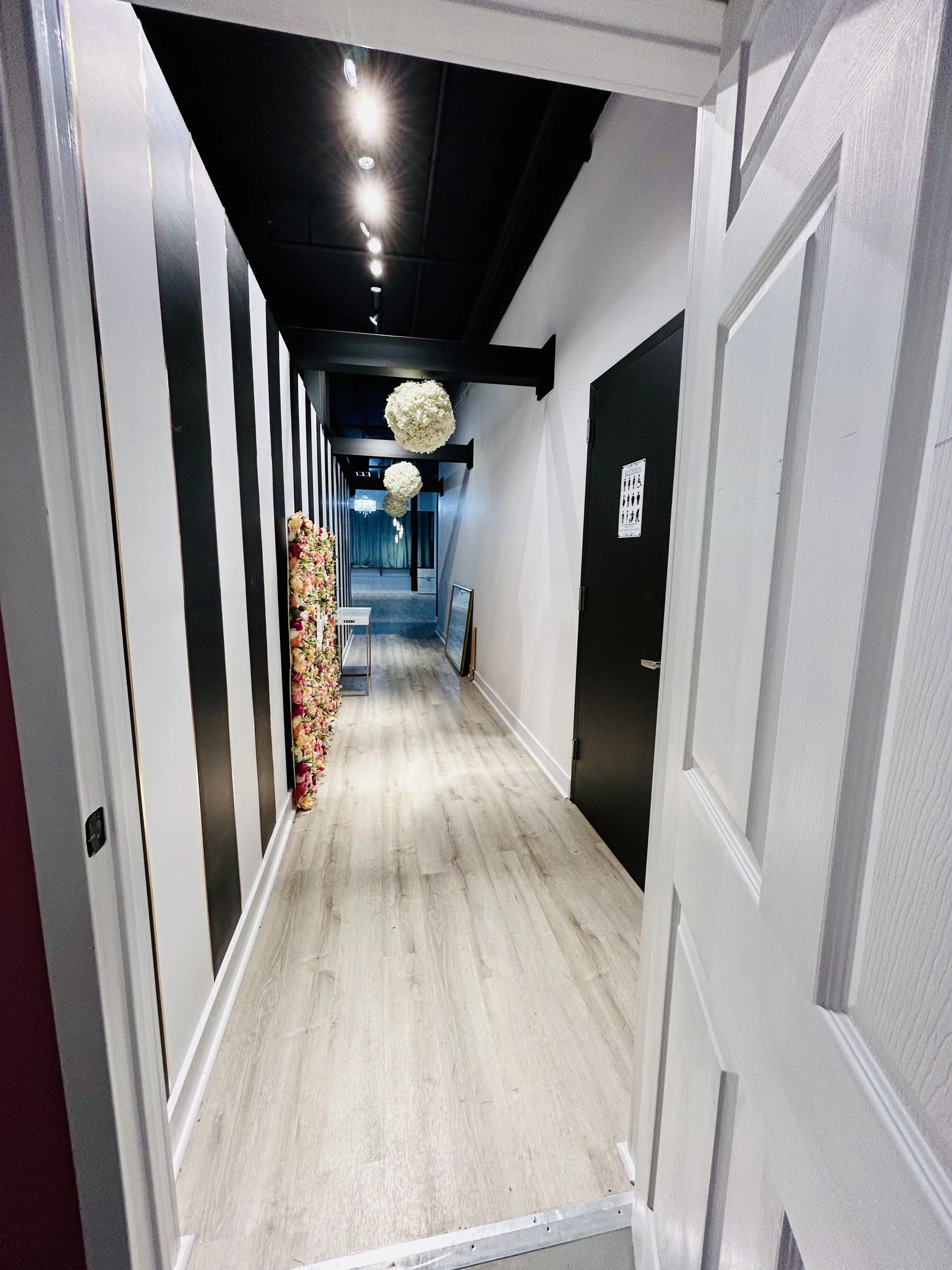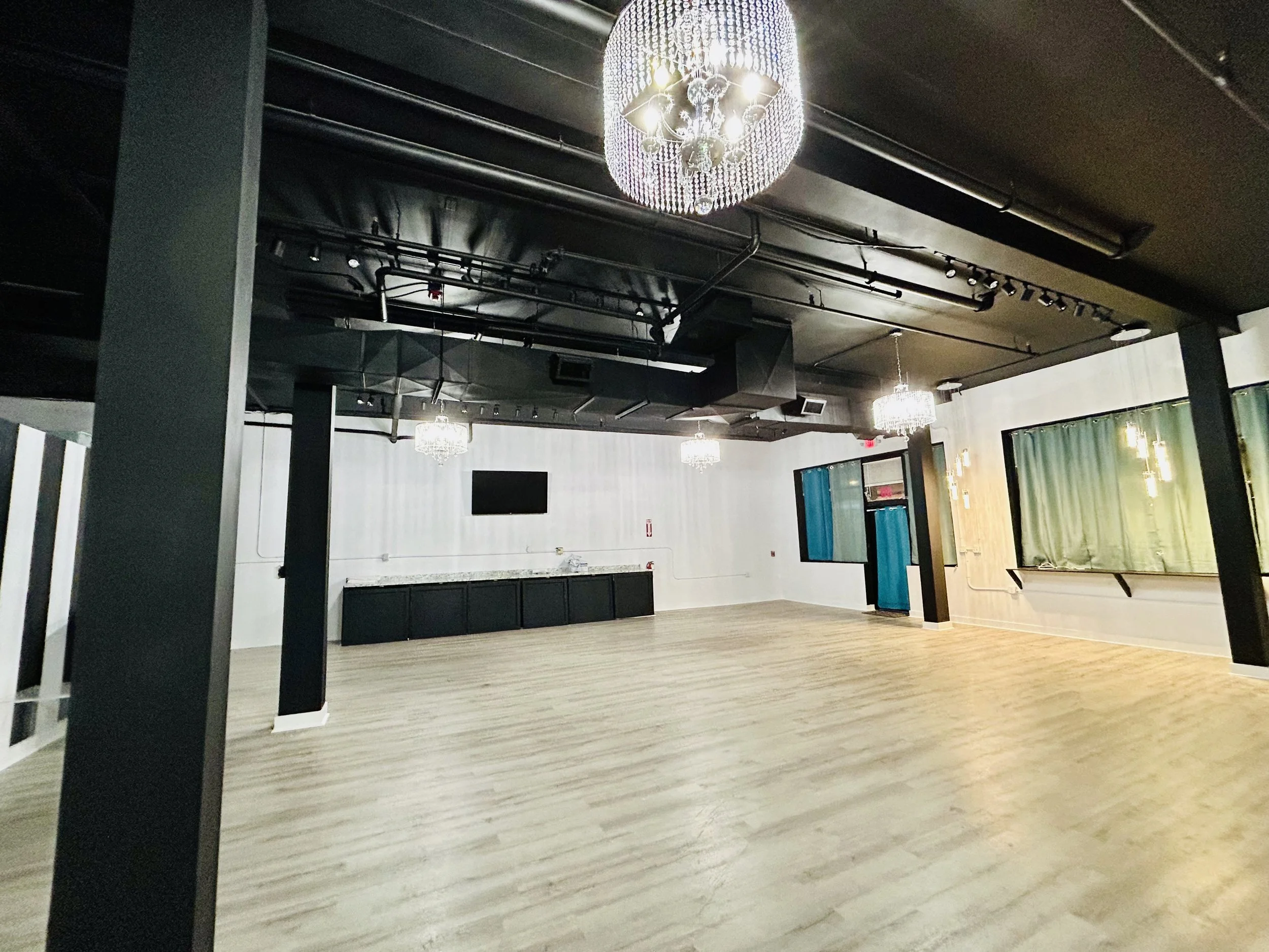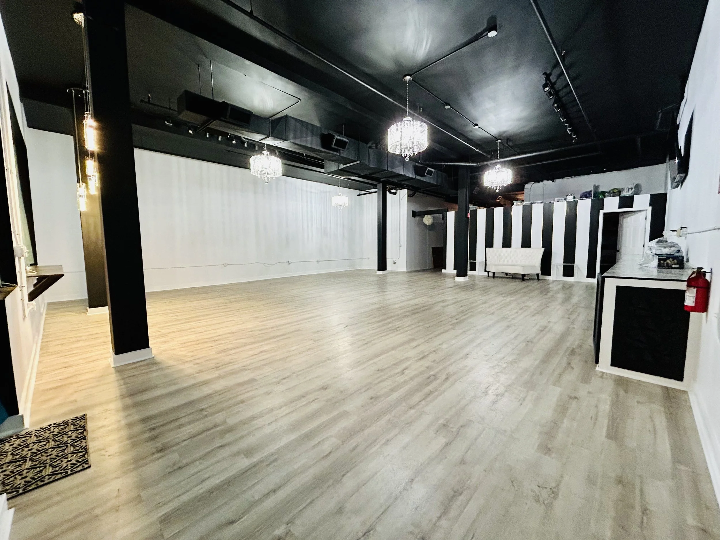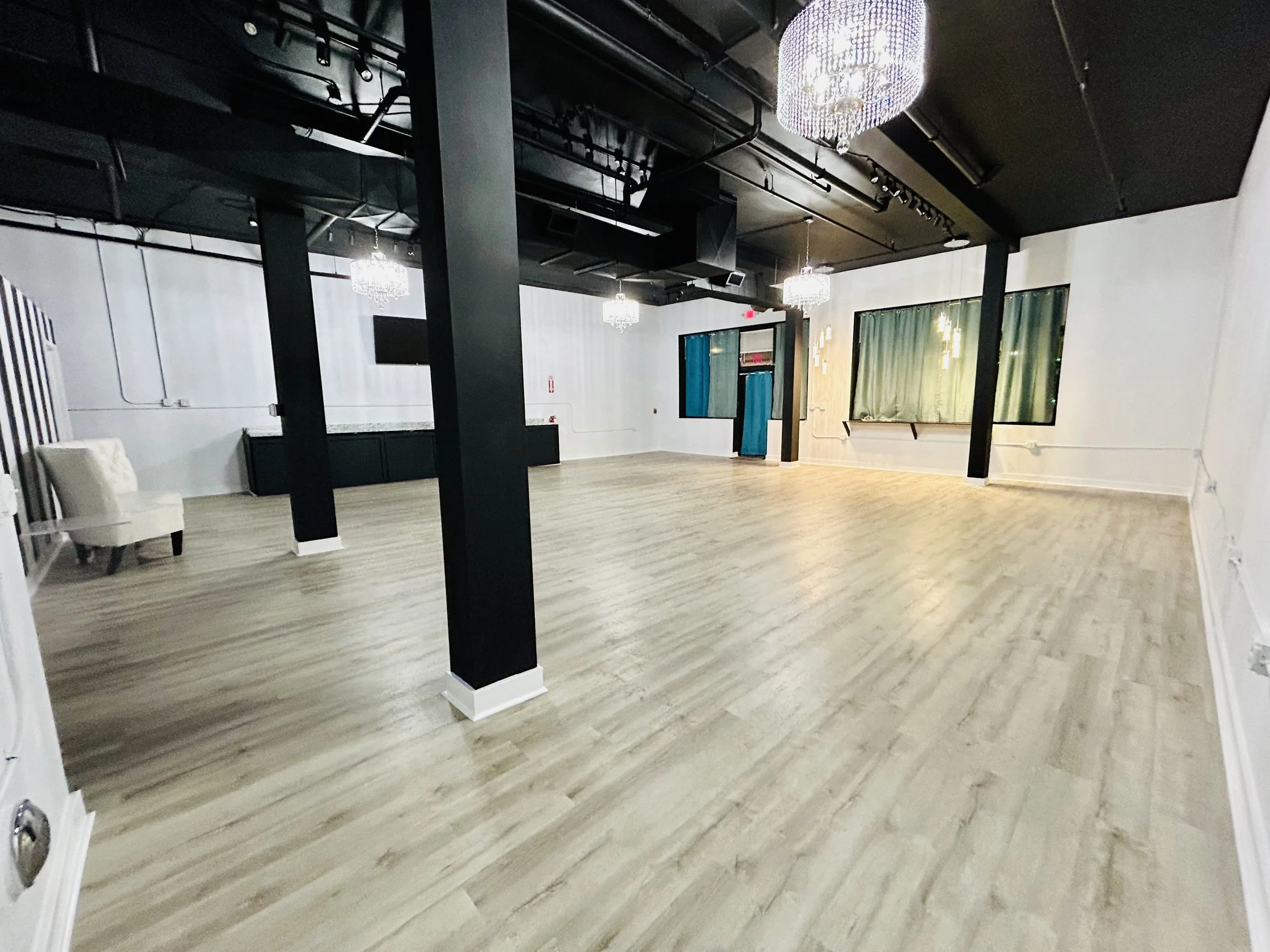 We offer a few options for our Event Space. It is open to book any time of the week. You can book the space for a little as 1 hour [Weekdays only] up to days at a time. The space is a little over 2,200 sqft collectively. The main space is in the shape of a square with a beautiful long hallway used for special entrances. It also leads into a small private kitchen to help with any food for the event. There is a long Buffet Style table top that can be used for food, gifts, candy table, etc. There are four gorgeous Chandeliers placed around the space. There are 2 modes of lighting and 7 light switches to help light the room how you choose. Are you ready to come by for a tour? Email, Text, or Call us to grab a date! 732-589-2018 / BakerSquaredEventSpace@Gmail.com